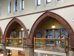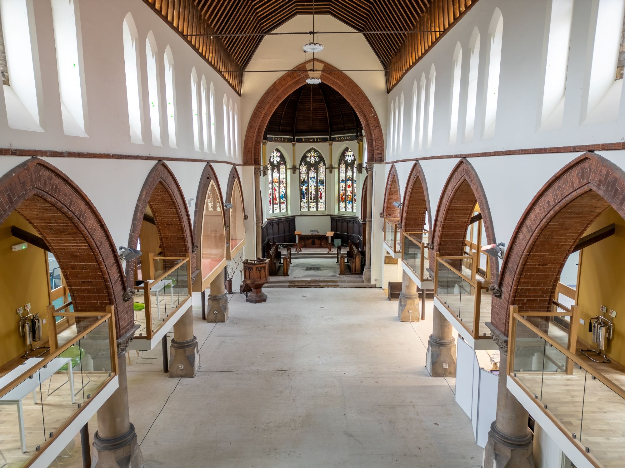 Watch a buzz of activity from on high in our showstopping first floor conference and meeting room. Pale birch arches frame top to floor glass panels, which look out over the beautiful church interior. Inside, hi-tech meets heritage where stained glass windows of doves look on as you utilise the latest AV equipment for your meeting.